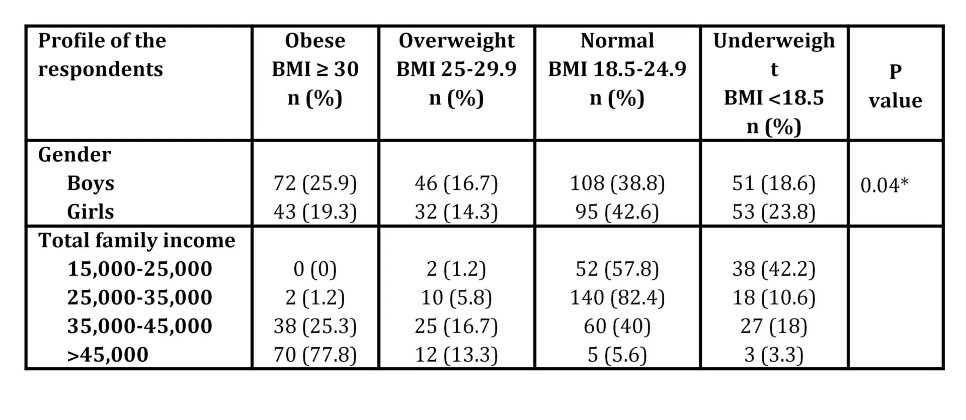 Table 3 presents the relationship between the socio-demographic profile and Body Mass Index (BMI) of the respondents. The prevalence of overweight and obesity among boys and girls was 46 (16.7%), 72 (25.9%) and 32 (14.3%), 43 (19.3%) respectively and the obtained data were statistically significant (p<0.05). They show that boys had higher prevalence of overweight and obesity than girls. Based on household monthly income, the children whose families earned above 45,000 thousand BDT per month had higher risk for overweight and obesity than those who came from below 15,000 thousand BDT per month household income i.e., high income showed a significant risk for obesity.