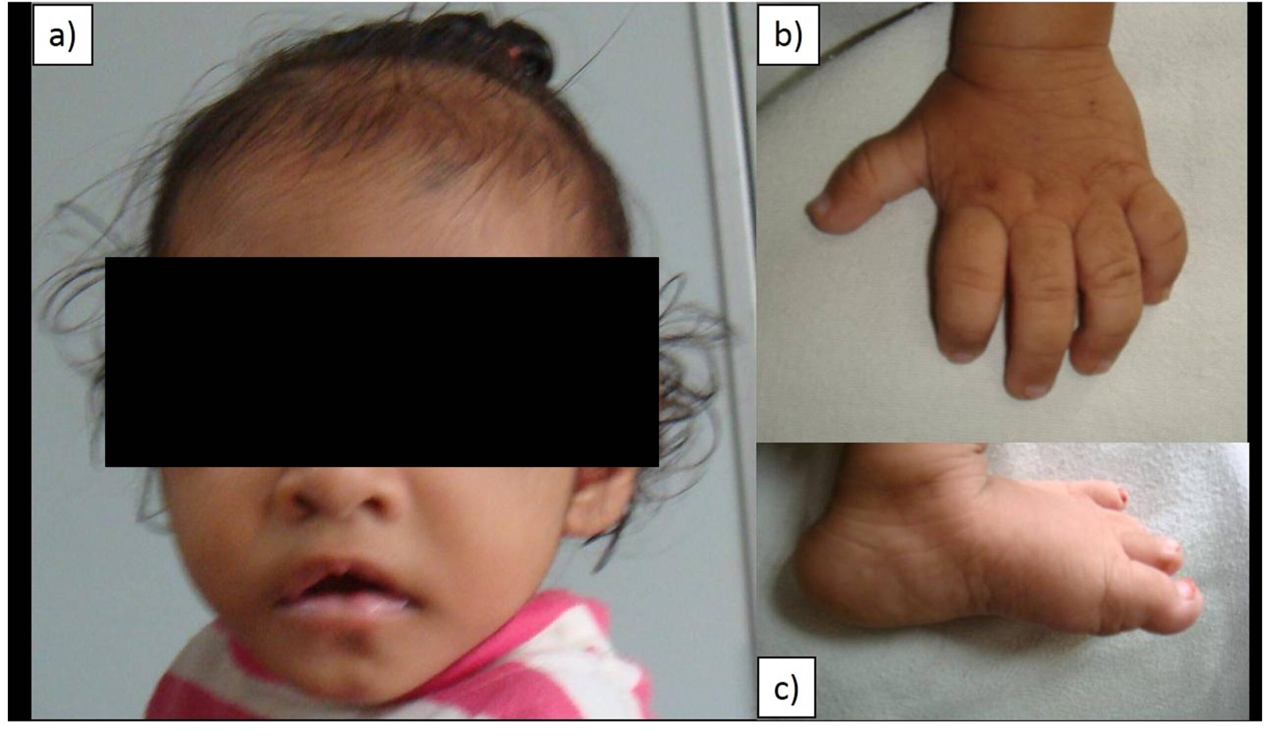 Her weight (6 kg) and her length ( 67 cm) were less than 3rd percentile for age according to World Health Organization(WHO) growth charts. Her head circumference was 42 cm which was less than 3 Standard deviation for age according to World Health Organization (WHO) growth charts; as well her weight for length was between 1 Standard deviation and 2 Standard deviation for age. Thus the child had failure to thrive, severe stunting and microcephaly. On examination, the child had characteristic facial features (Figure 1) — interrupted eyebrows, long palpebral fissure, depressed nasal bridge, low set ears, high arched cleft palate, short fifth digit with clinodactyly and finger pads, hypotonia, overlapping of toes and rocker bottom feet. The child is unusually sociable with a happy disposition and had delayed milestones in all domains.
