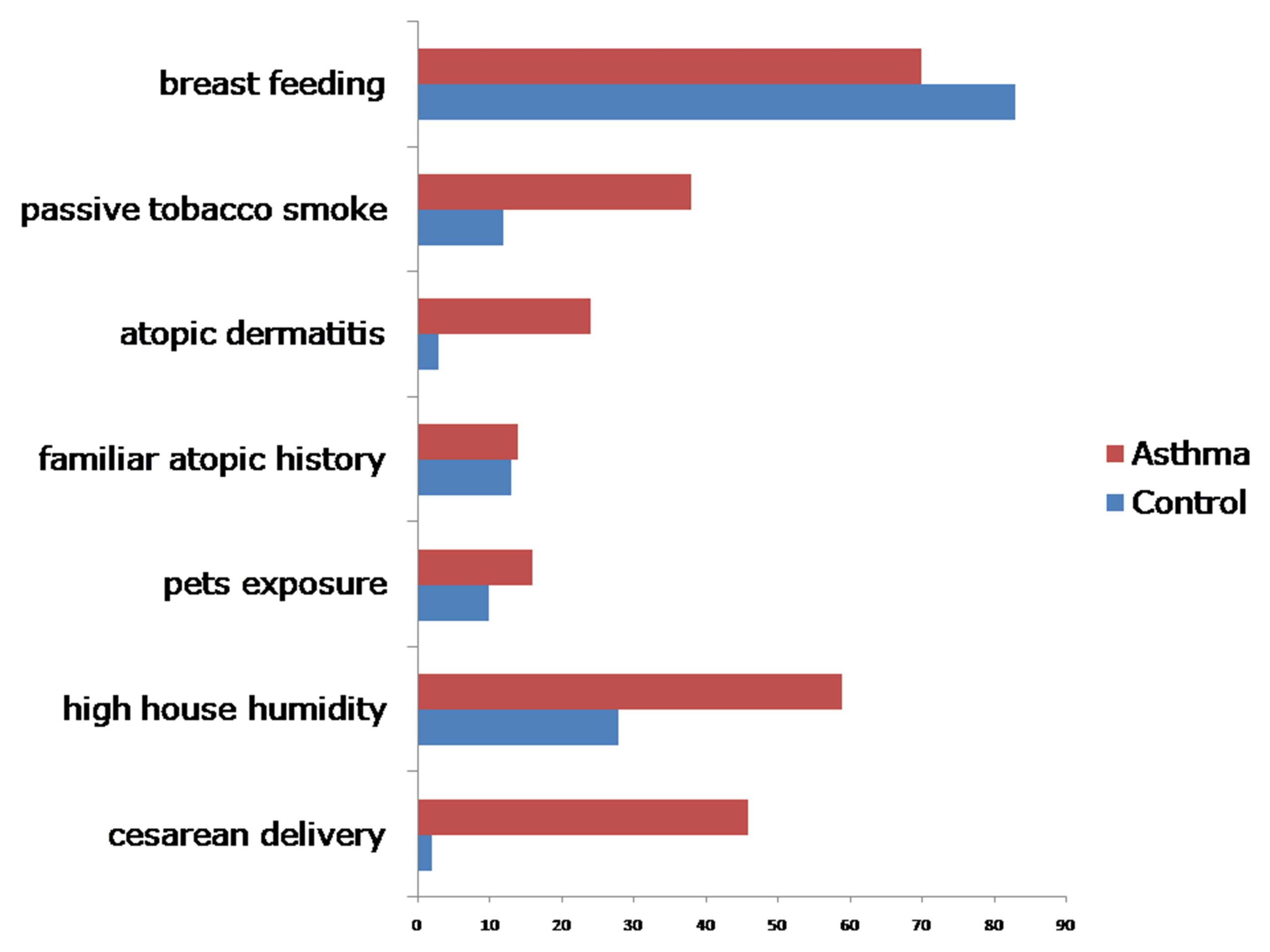 Figure 1: Frequency (%) of exposure to risk factors in control and asthma