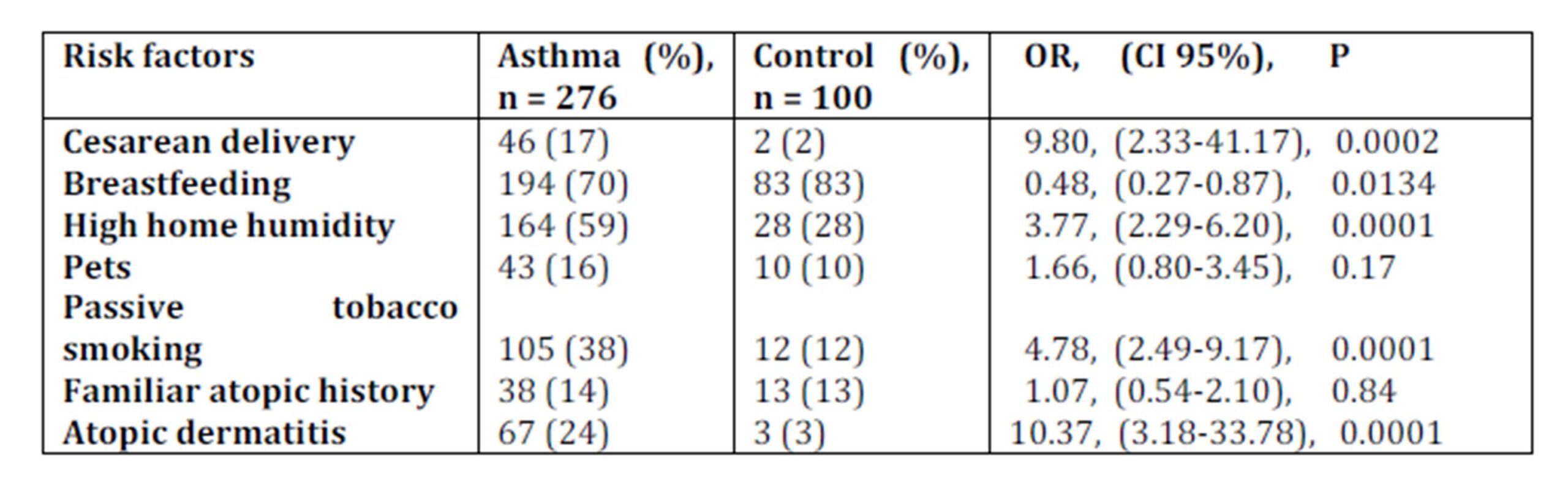 Our study shows a significant association of bronchial asthma with cesarean delivery (46/276 vs. 2/100, OR 9.8, CI 2.33-41.17, p = 0.0002), high indoor humidity exposure (164/276 vs. 28/100, OR 3.77, CI 2.29-6.2, p = 0.0001), environmental tobacco smoke (105/276 vs. 12/100, OR 4.78, CI 2.49-9.17, p = 0.0001), as well as the presence of atopic dermatitis (67/276 vs. 3/100, OR 10.37, CI 3.18-33.78, p = 0.0001). Breastfeeding on the other part resulted in a protective factor (194/276 vs. 83/100, OR 0.48, CI 0.27-0.87, p = 0.0134). Both, family atopic history (38/276 vs. 13/100, OR 1.07, CI 0.54-2.1, p = 0.84) and pet exposure findings (43/276 vs. 10/100, OR 1.66, CI 0.8-3.45, p = 0.17) were statistically insignificant (see Table 1).