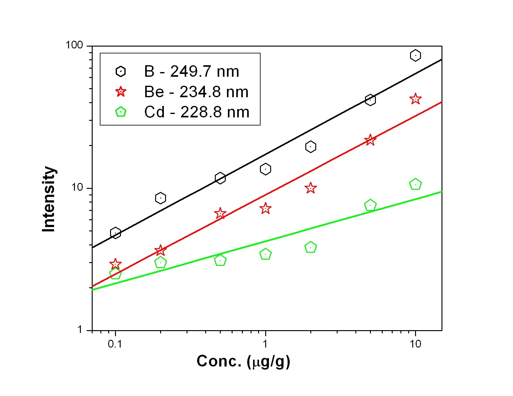 Fig. 1 represents the calibration curves of Co, Cr and Mg, It was observed that though the background intensity of Co 228.6 nm line is more than that of 242.4 nm line, the sensitivity of the former line is an order of magnitude better. 425.4 nm emission line of Cr was found to have slightly better analytical performance with respect to sensitivity and detection limit in comparison with 357.8 nm line of Cr. Mg 280.2 nm line was found to have lower background as well as better sensitivity than 282.5 nm analytical channel. The calibration curves for B- 249.7 nm, Be — 234.8 nm and Cd — 228.8 nm lines were shown in Fig. 2. The calibration curves for B, Be and Cd were obtained in the concentration range of 0.1 µg/g — 10 µg/g while that of Sn 242.1 nm line [Fig. 3] was 1 µg/g — 100 µg/g.