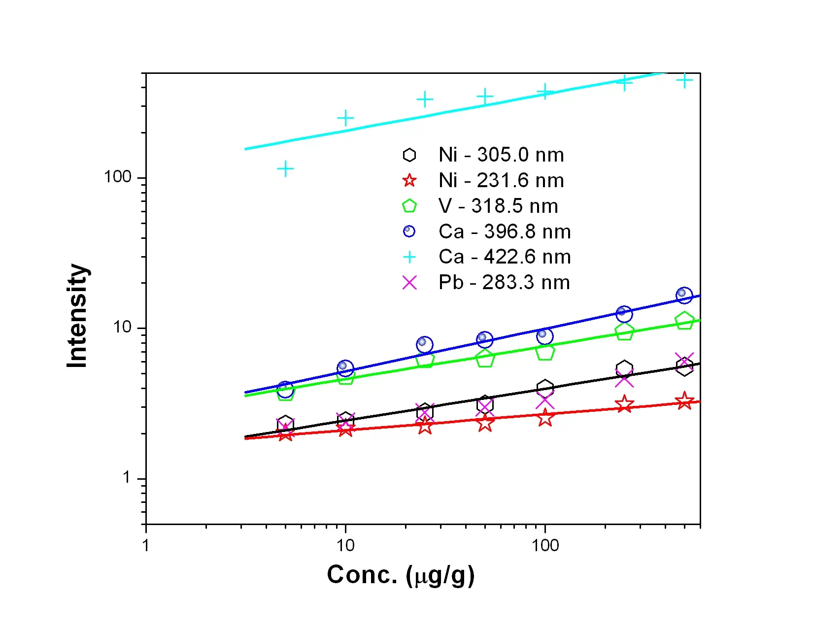Figure 5: Calibration curves for Ni, V, Ca and Pb