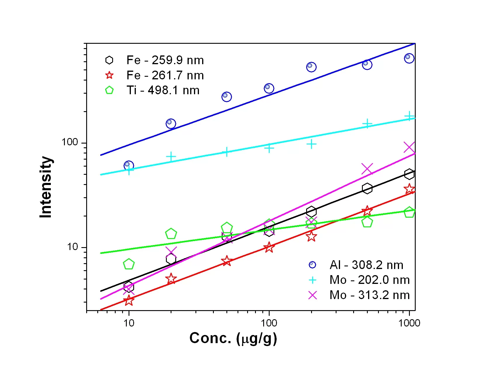 Figure 6: Calibration curves for Fe, Ti, Al and Mo